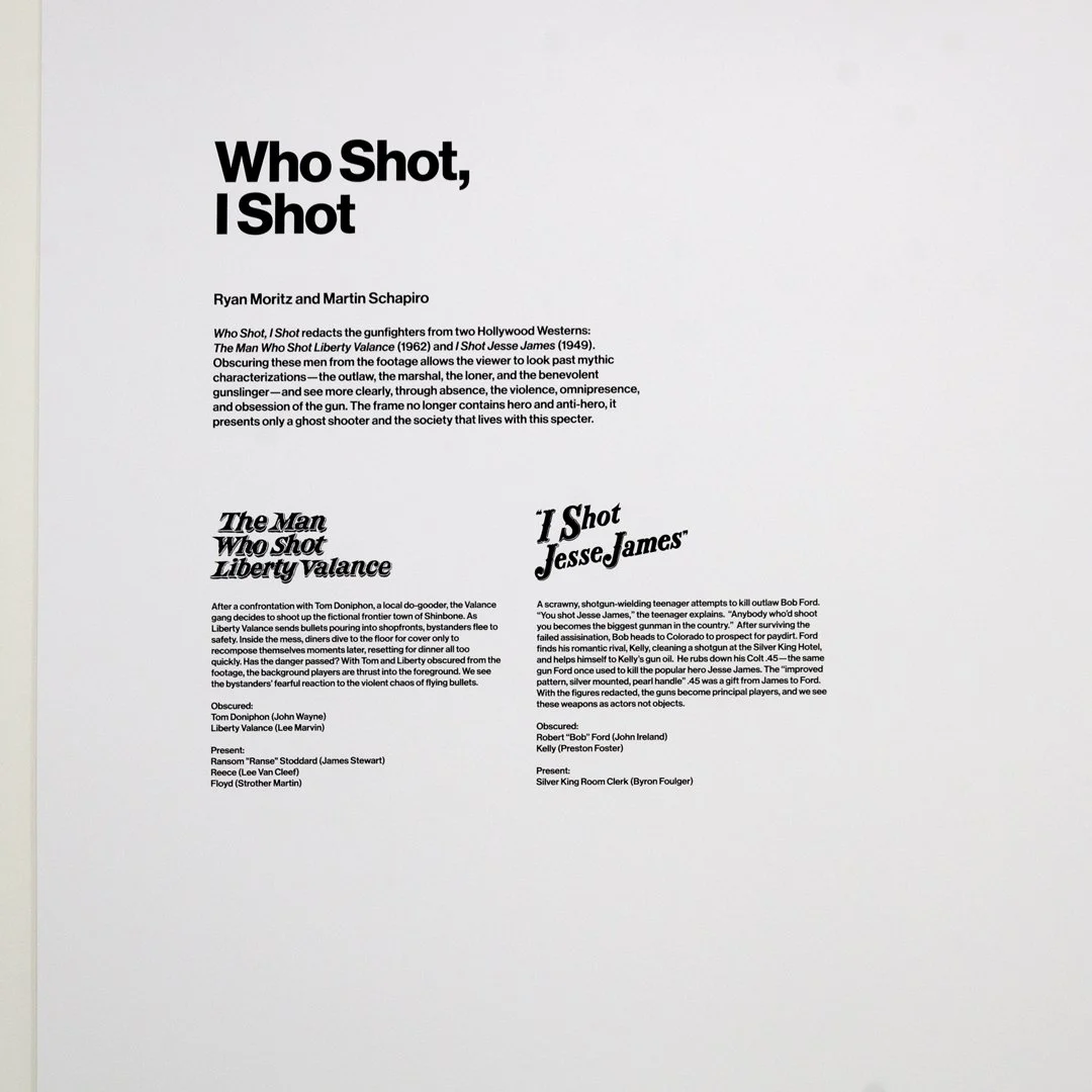 Who Shot, I Shot redacts the gunfighters from two Hollywood Westerns: The Man Who Shot Liberty Valance (1962) and I Shot Jesse James (1949). Obscuring these men from the footage allows for the viewer to look past mythic characterizations — the outlaw, the marshal, the loner, and the benevolent gunslinger — and see more clearly, through absence, the violence, omnipresence, and obsession of the gun. The fram no longer contains hero and anti-hero, it presents only a ghost shooter and the society that lives with this specter.